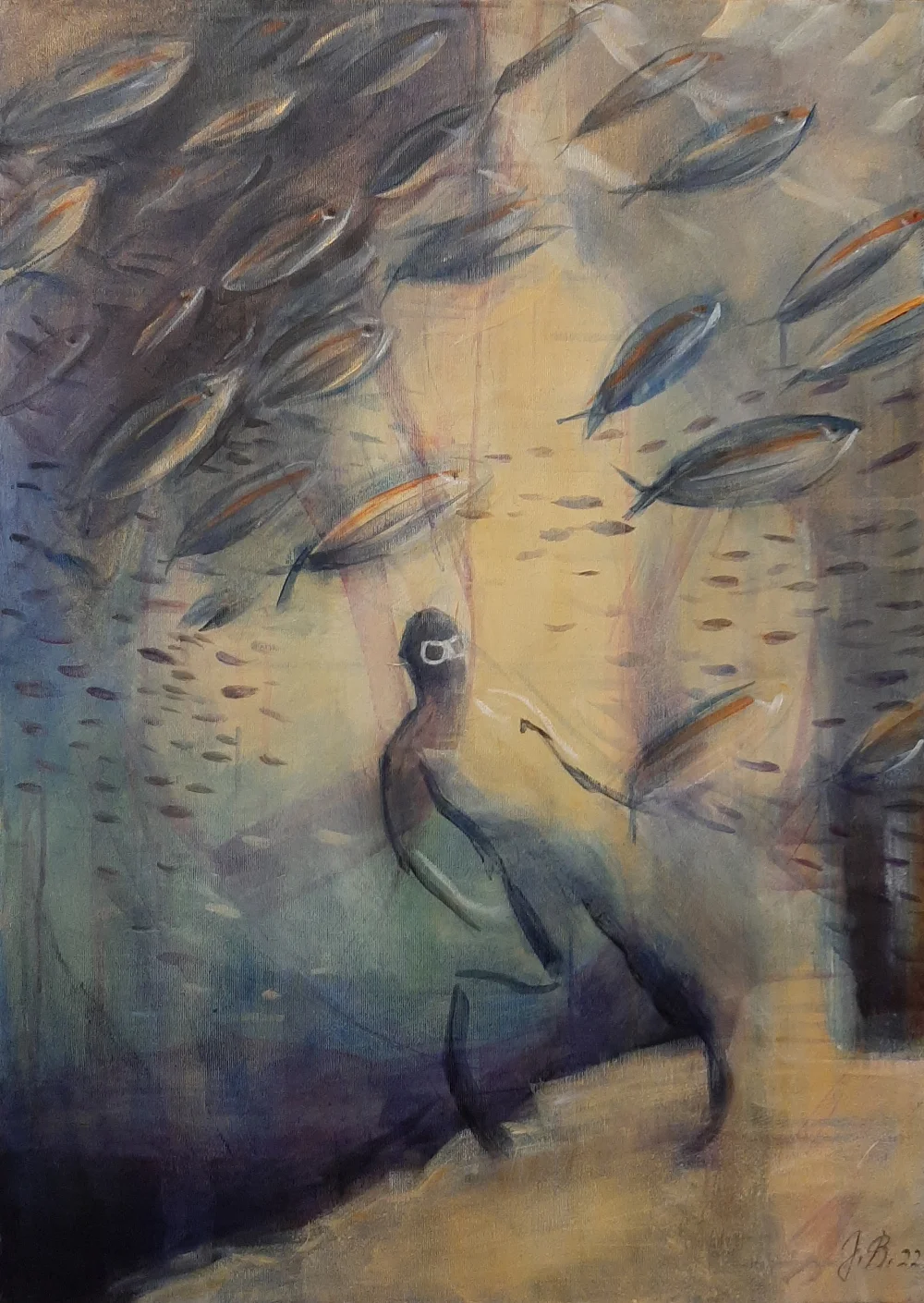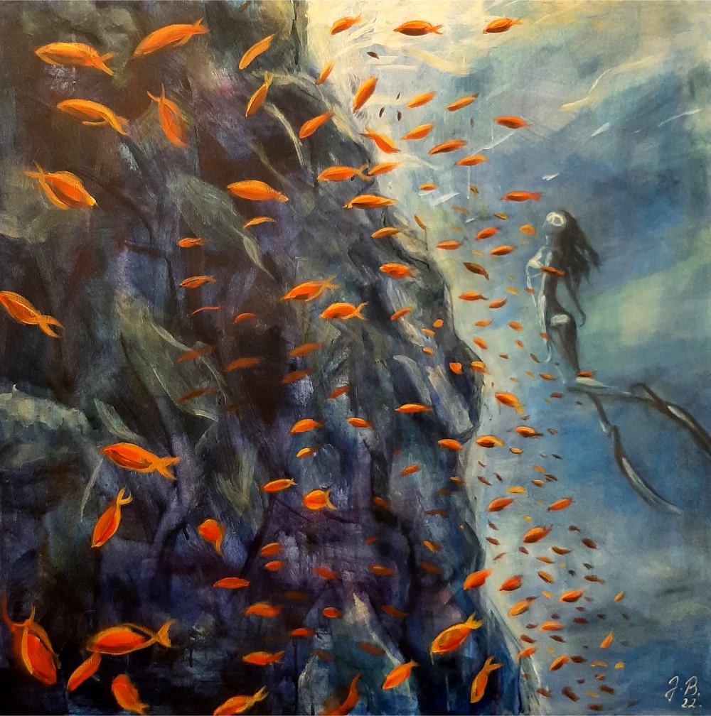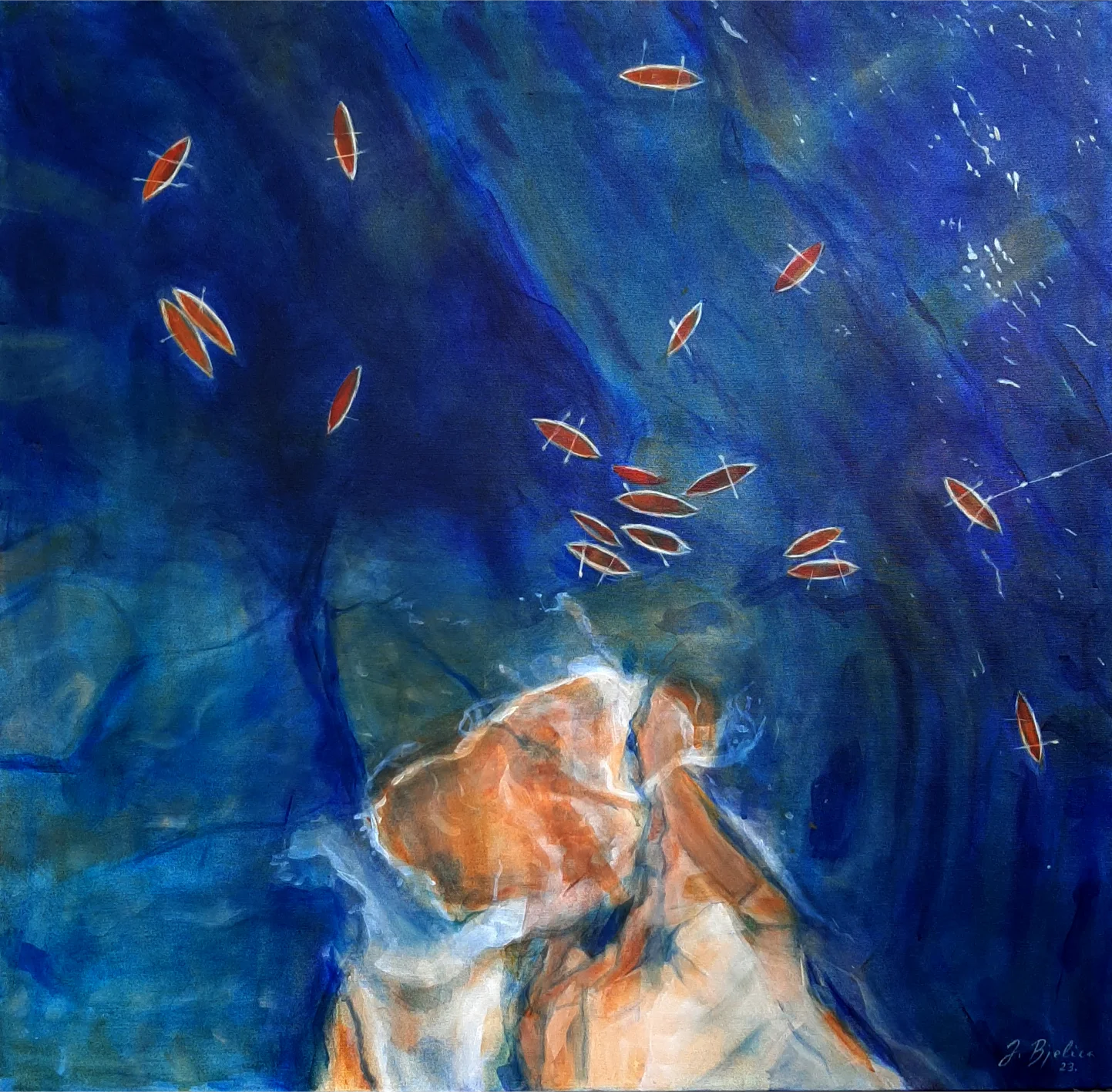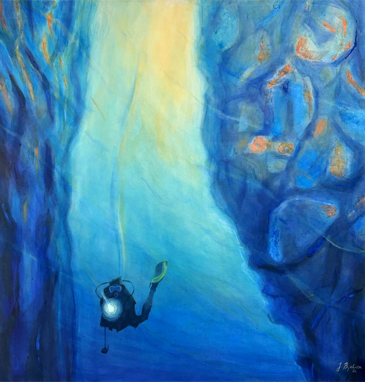 Raspravljati o simbolici kolorita primenjenog na ovim delima (plave i oker površine, snažna crna kontura, akcenti crvenog) skoro da je nepotrebno. Sve odiše kristalnom jasnošću. Teško je zamisliti da postoji, u ljudskom rodu, neko ko i bez uvodnih reči ne bi i sam shvatio sve poruke mlade autorke. Večna metafizičnost teme pojačana potpunom ličnom urbanizacijom kao i svešću o opštem otuđenju čoveka od sebe samog , te koloritna univerzalnost, omogućili su Jeleni da savremenim i razumljivim likovnim jezikom iskaže put kojim nije loše proći ukoliko se za cilj ima konačno umetničko sazrevanje.